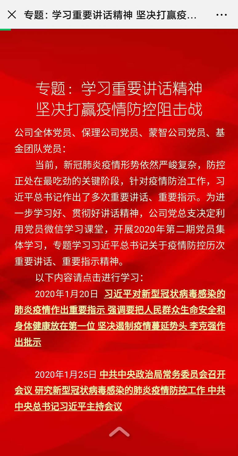 用好“互联网+学习课堂”,疫情期间理论武装不放松。利用党员微信学习课堂、学习强国APP等载体,国资运营公司党员干部专题系统学习了习近平总书记关于疫情防控、经济社会发展等重要讲话精神以及党中央和自治区党委关于疫情防控的决策部署、命令。借助H5新媒体手段,公司党总支制作了《党员倡议书》,宣传号召党员干部争当疫情防控志愿者,为疫情防控作出贡献。通过微信群等载体,公司党员发挥主动性,自觉在学习群中分享新近政策、理论和法律法规等学习内容,随时随地“指尖学习”。多种信息化手段的采用,让公司党员在不聚集的同时,学习不断线、教育不空档。