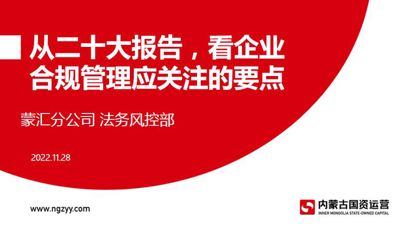 为深入学习贯彻党的二十大精神,落实全面依法治国战略部署,深化法治企业建设,切实防控风险,保障企业高质量发展,11月28日,蒙汇社保分公司开展了题为“从二十大报告,看企业合规管理应关注的要点”的专项合规培训。